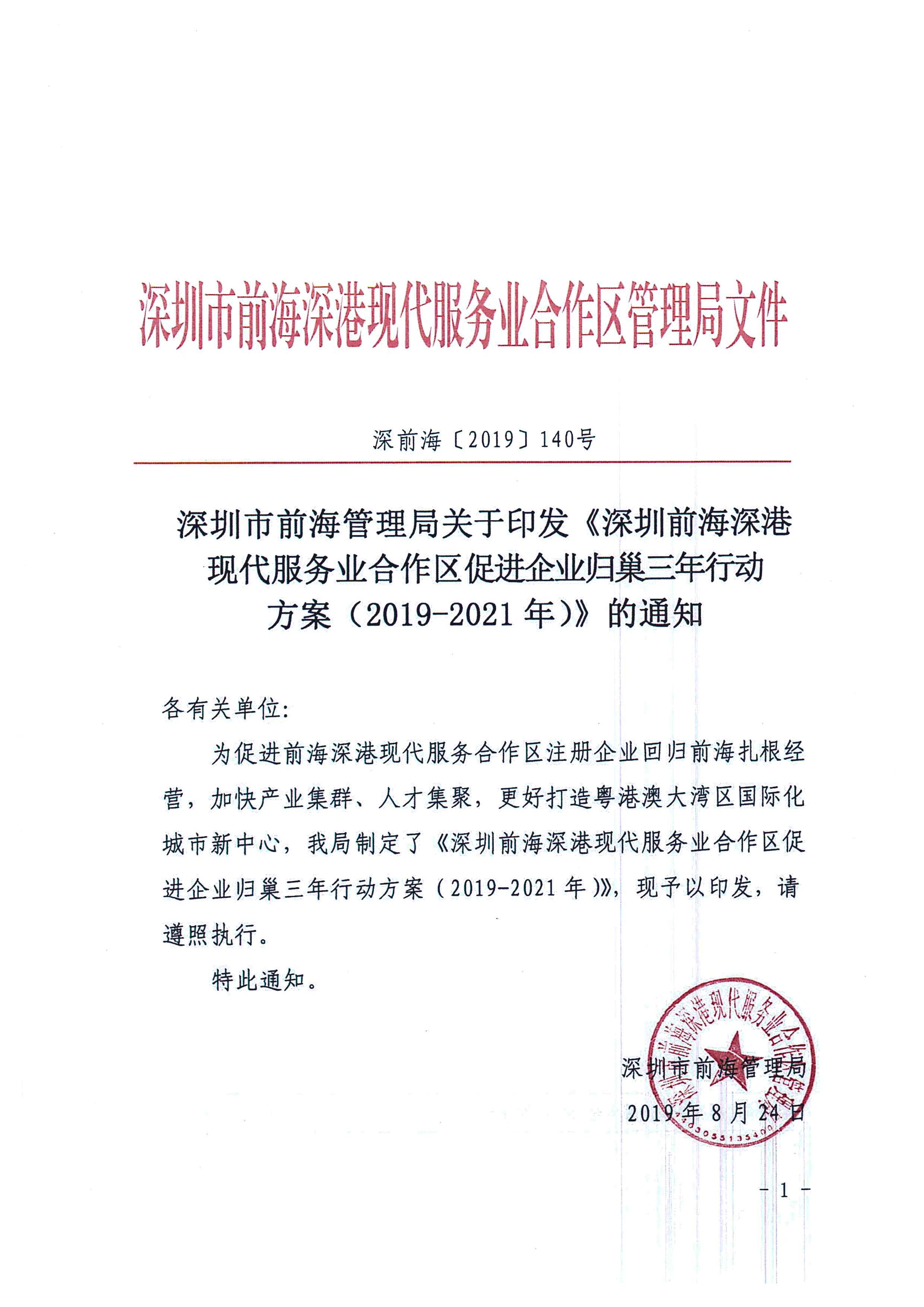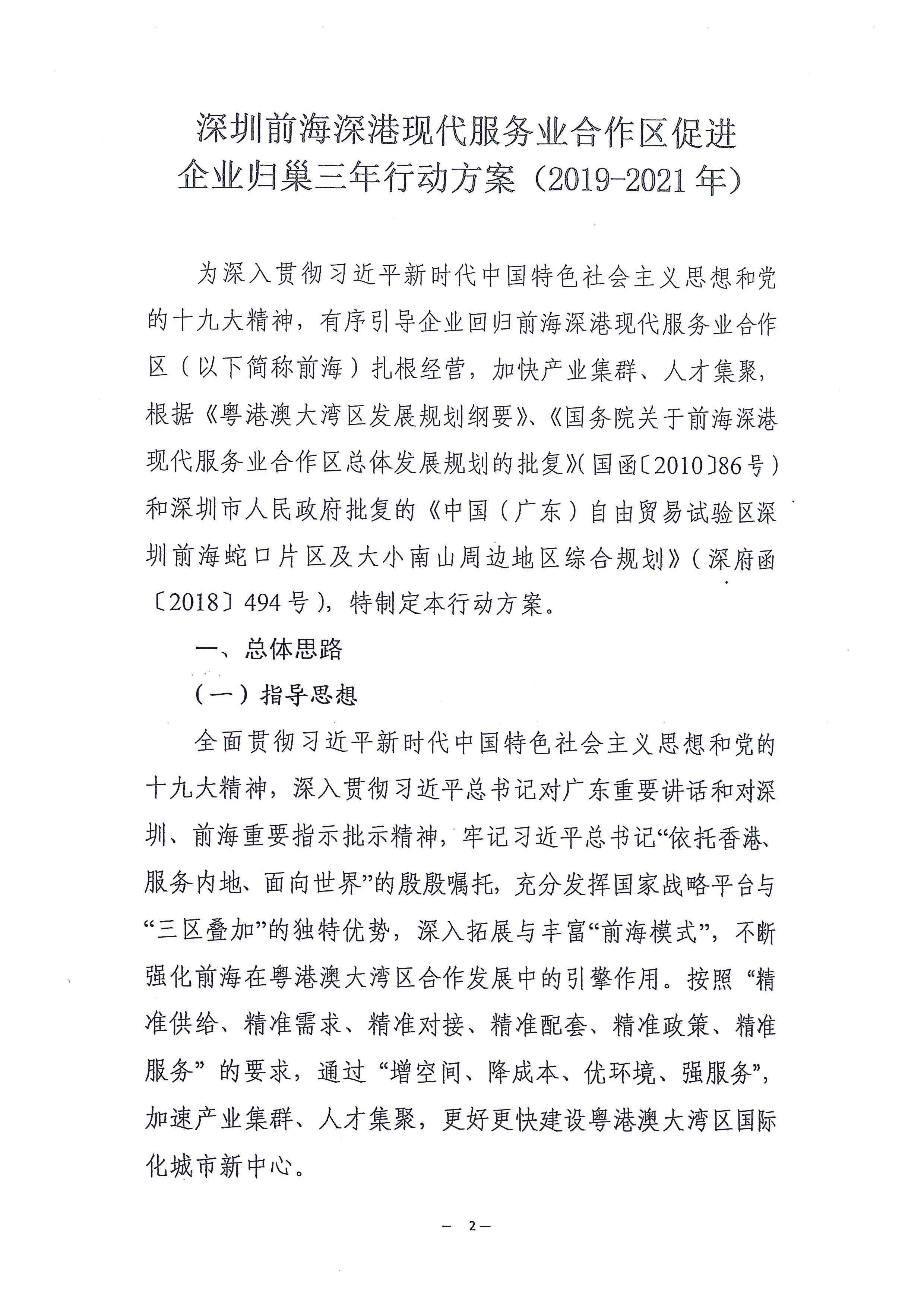 《深圳前海深港現(xiàn)代服務(wù)業(yè)合作區(qū)促進企業(yè)歸巢三年行動方案(2019-2021年)》