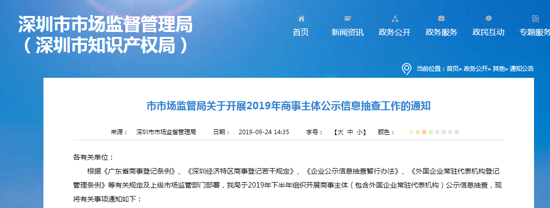 今年9月份深圳市市場監(jiān)督管理局依據(jù)下發(fā)《關(guān)于開展2019年商事主體公示信息抽查工作的通知》,已經(jīng)組織開展商事主體(包含外國企業(yè)常駐代表機構(gòu))公示信息抽查,下面我們來講一下相關(guān)關(guān)事項: