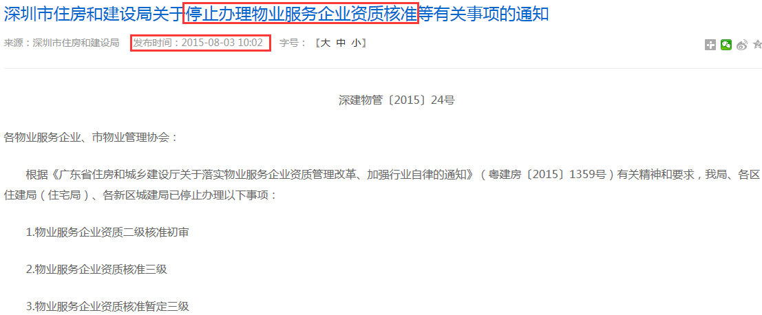 那客戶為什么會這么問呢?那是之前確實有個《物業(yè)服務企業(yè)資質》,而且分一、二、三等級,但在2015年的時候,深圳市就取消物業(yè)服務企業(yè)資質核準,如下圖: