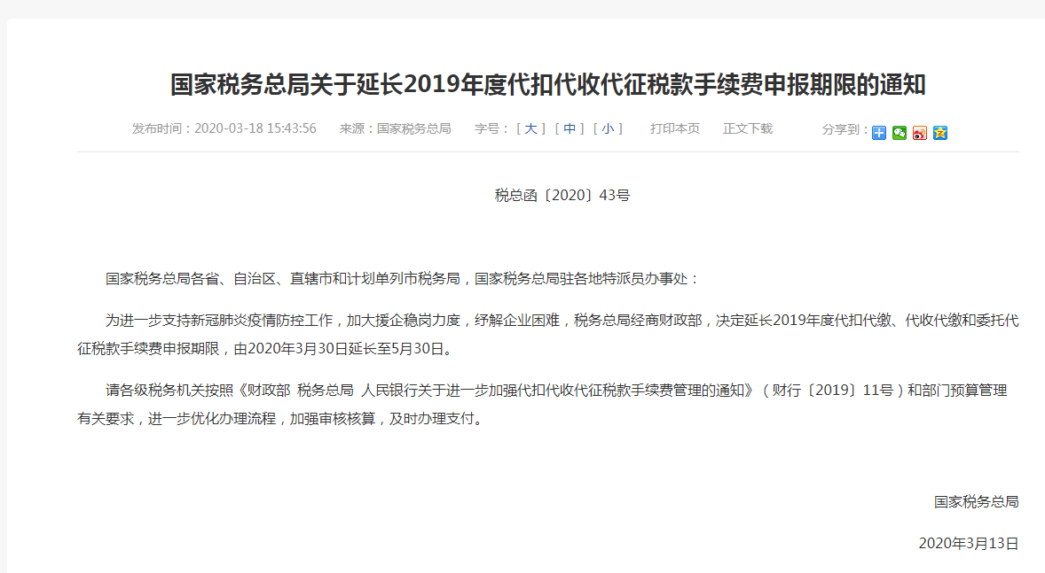 福利!!!代扣代繳代征手續(xù)費(fèi)申報(bào)延長至5月30日