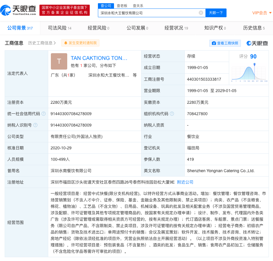近日,深圳永和大王餐飲有限公司發(fā)生工商變更,經(jīng)營范圍新增房地產(chǎn)經(jīng)紀(jì);經(jīng)營電子商務(wù);初級農(nóng)產(chǎn)品的銷售;貨物及技術(shù)進出口;單用途預(yù)付卡的銷售;會議及展覽策劃;軟件開發(fā)、技術(shù)服務(wù)、技術(shù)咨詢、技術(shù)轉(zhuǎn)讓等。深圳永和大王餐飲有限公司成立于1999年1月,注冊資本為2280萬美元,法定代表人為TAN CAKTIONG TONY(陳覺中)