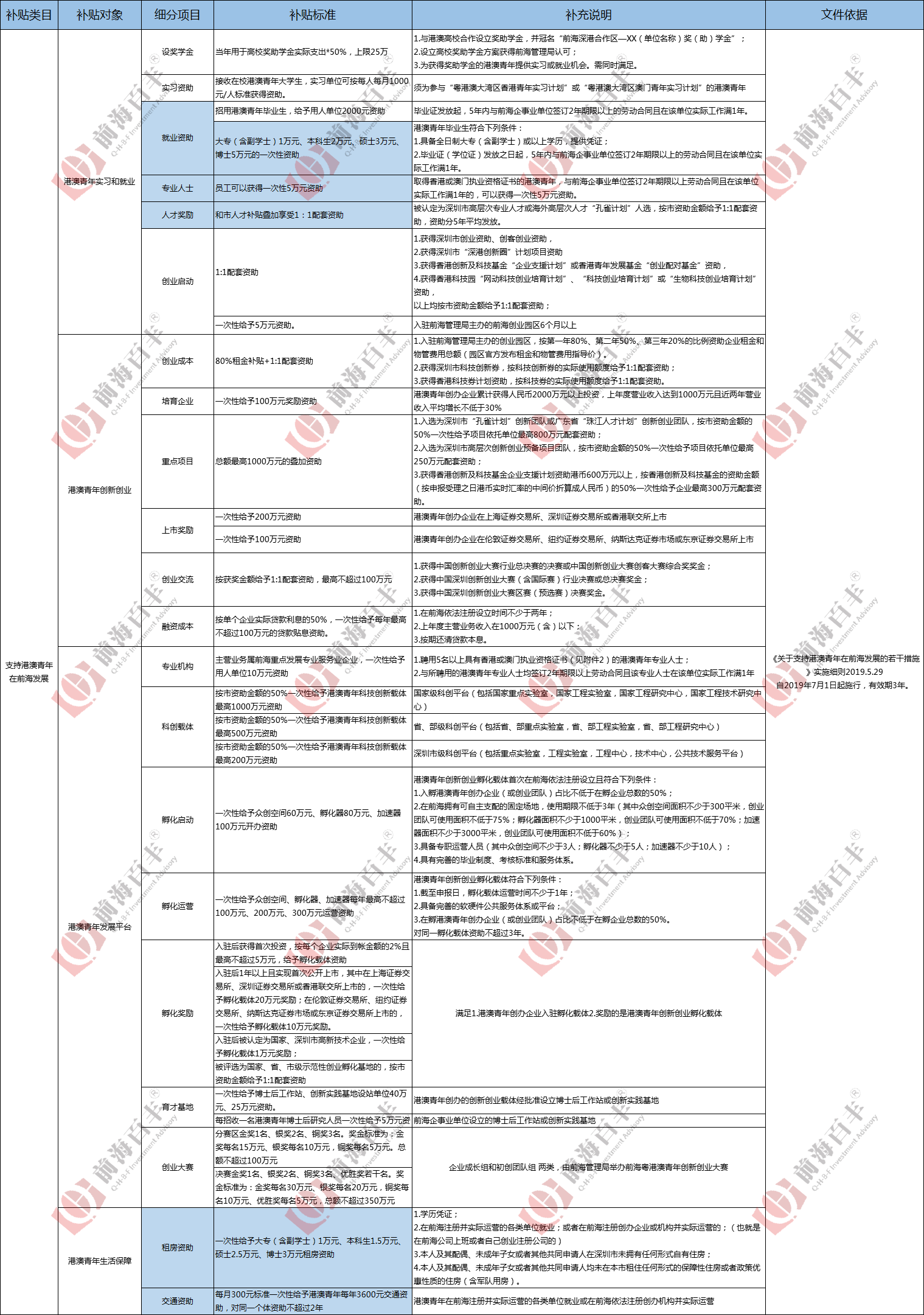 對(duì)于支持港澳青年在前海發(fā)展的政策內(nèi)容,我也整理總結(jié)了全概覽,涵蓋了就業(yè)、創(chuàng)業(yè)、發(fā)展平臺(tái)和生活保障各個(gè)方面的內(nèi)容,前海百豐提供前海企業(yè)入駐一站式服務(wù),詳情如下表: