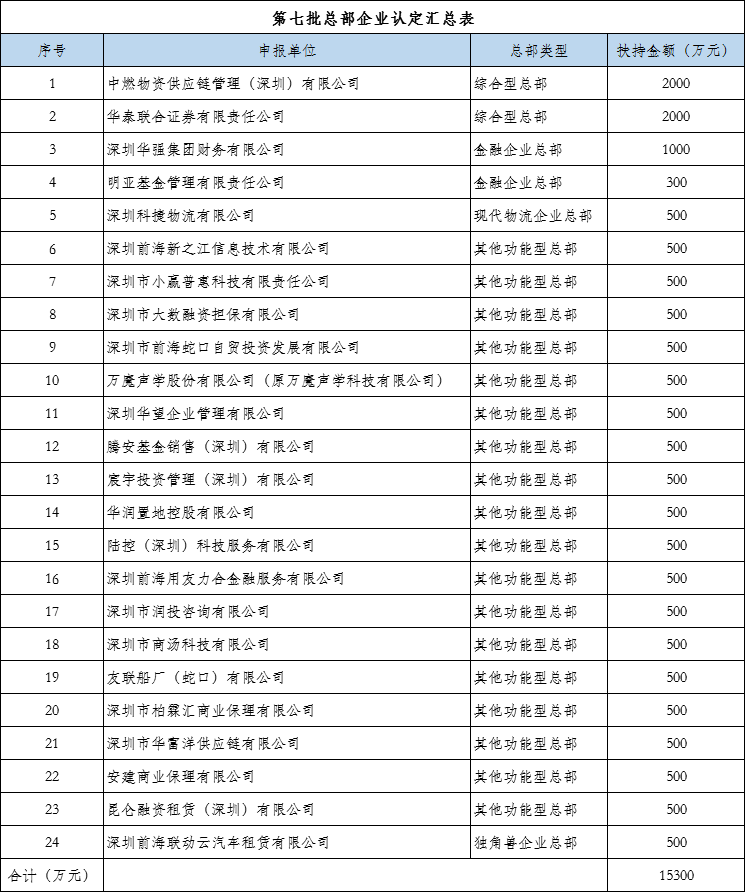 昨日,前海管理局公示了第七批總部企業(yè)名單,扶持企業(yè)最高獲得2000萬的總部企業(yè)扶持資金,具體名單如下: