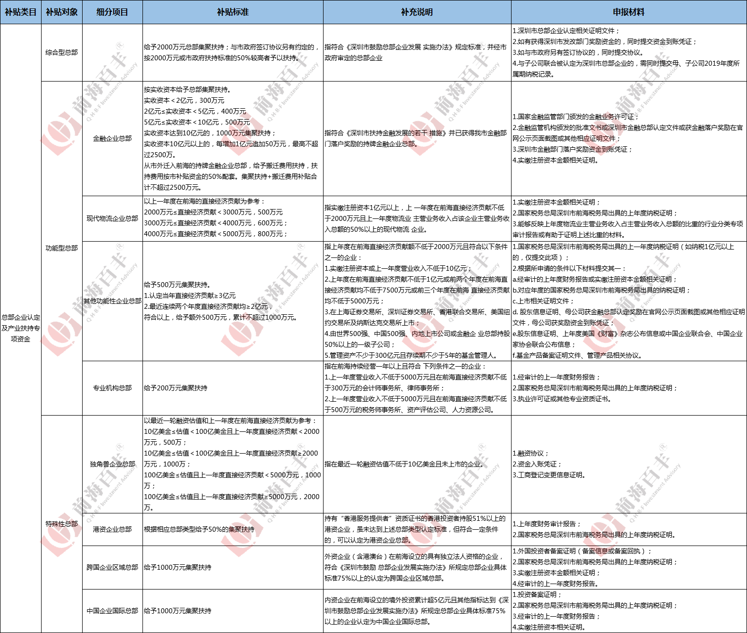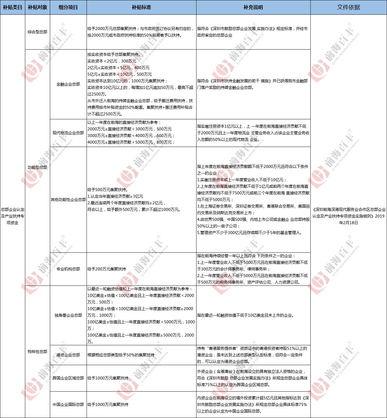前海郭大俠這里總結(jié)歸類了前??偛科髽I(yè)扶持政策的各個(gè)項(xiàng)目和補(bǔ)貼標(biāo)準(zhǔn),詳情如下: