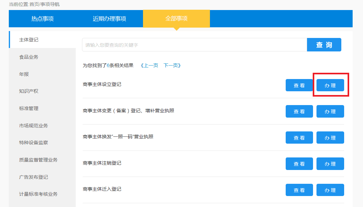 點擊“商事主體設(shè)立登記”并按照流程指示進行公司設(shè)立申請。