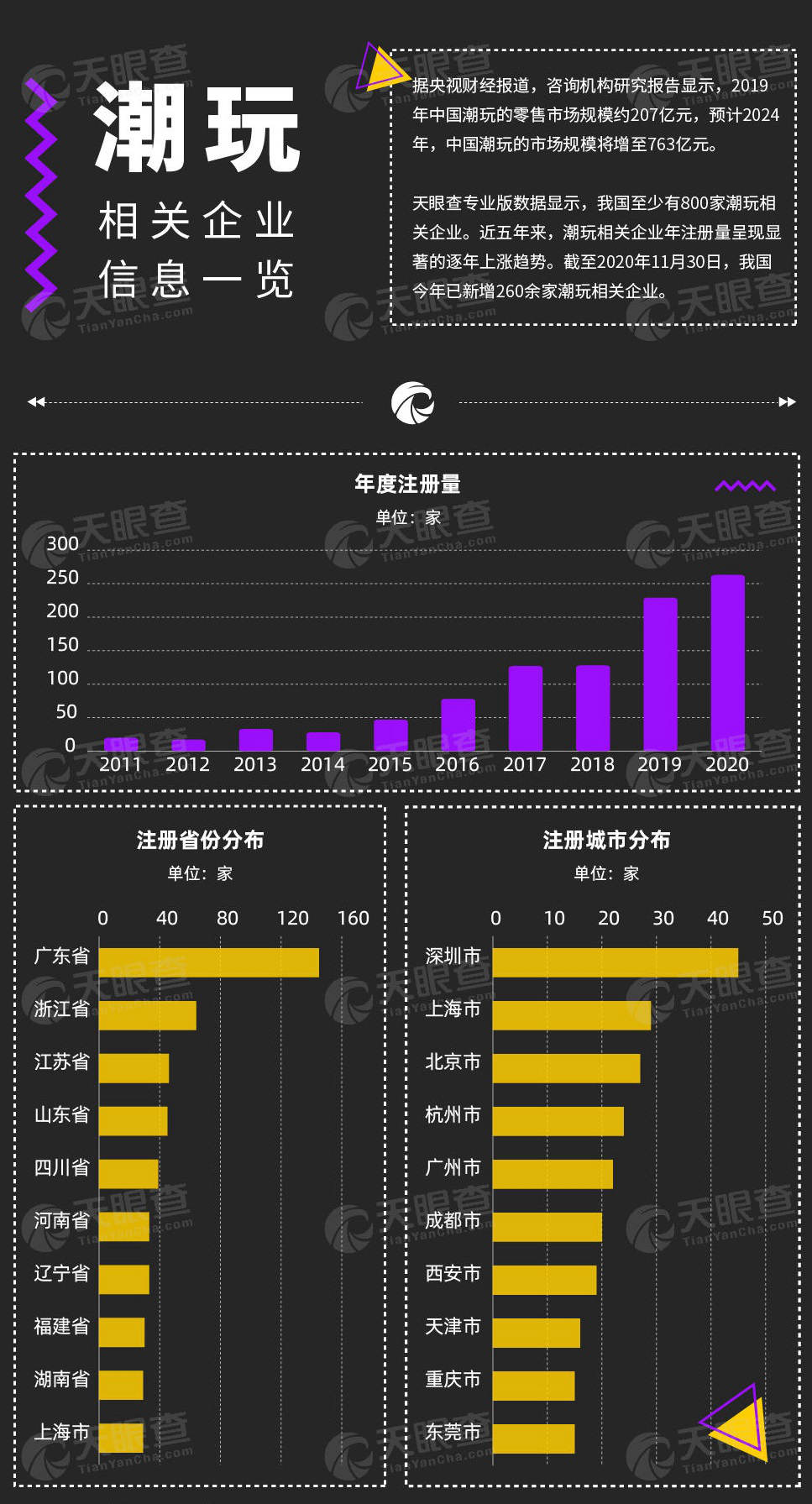 天眼查數(shù)據(jù)顯示,我國至少有800家企業(yè)的名稱含“潮玩、潮流玩具”,或產(chǎn)品標(biāo)簽或項(xiàng)目品牌含“潮玩”,且狀態(tài)為在業(yè)、存續(xù)、遷入、遷出的潮玩相關(guān)企業(yè)。其中,24%的相關(guān)企業(yè)為有限責(zé)任公司,73%為個體工商戶。地域分布方面,從省份來看,廣東省的潮玩相關(guān)企業(yè)數(shù)量最多,近150家。其次是浙江、江蘇和山東三個省份,均有40家以上相關(guān)企業(yè),從城市來看,深圳市的潮玩相關(guān)企業(yè)數(shù)量最多,超過40家。
