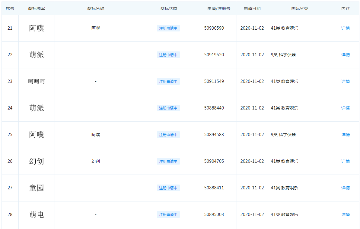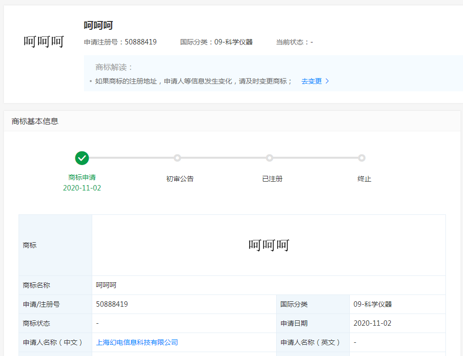 近日,上?;秒娦畔⒖萍加邢薰?/span>(嗶哩嗶哩)新增多條商標申請信息,商標名稱為“呵呵呵”,商標分類為41-教育娛樂,9-科學儀器。商標狀態(tài)為商標申請中,另外,該公司還申請了“萌派”“阿噗”等商標。