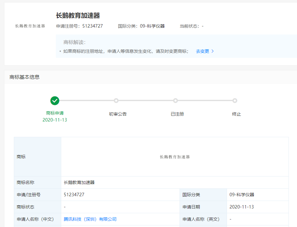 騰訊申請“長鵝教育加速器”商標(biāo)