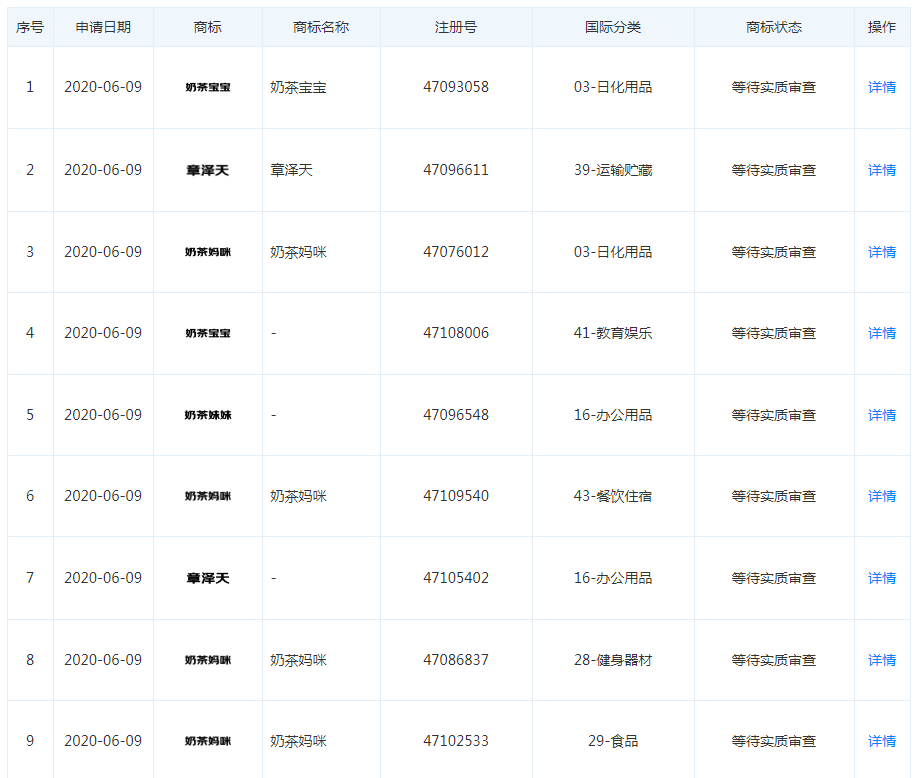 近日,江蘇章澤天文化發(fā)展有限公司新增多條“奶茶媽咪”“奶茶寶寶”“奶茶寶貝”等商標(biāo),商標(biāo)國(guó)際分類涉及日化用品、教育娛樂、餐飲住宿等,申請(qǐng)日期為2020年6月9日,商標(biāo)狀態(tài)為等待實(shí)質(zhì)審查。江蘇章澤天文化發(fā)展有限公司成立于2014年12月15日,法定代表人為章澤天,注冊(cè)資本為1000萬,經(jīng)營(yíng)范圍包含文化產(chǎn)業(yè)投資,電視節(jié)目制作、發(fā)行,經(jīng)營(yíng)演出及經(jīng)紀(jì)業(yè)務(wù)等。該公司由章澤天全資控股。
