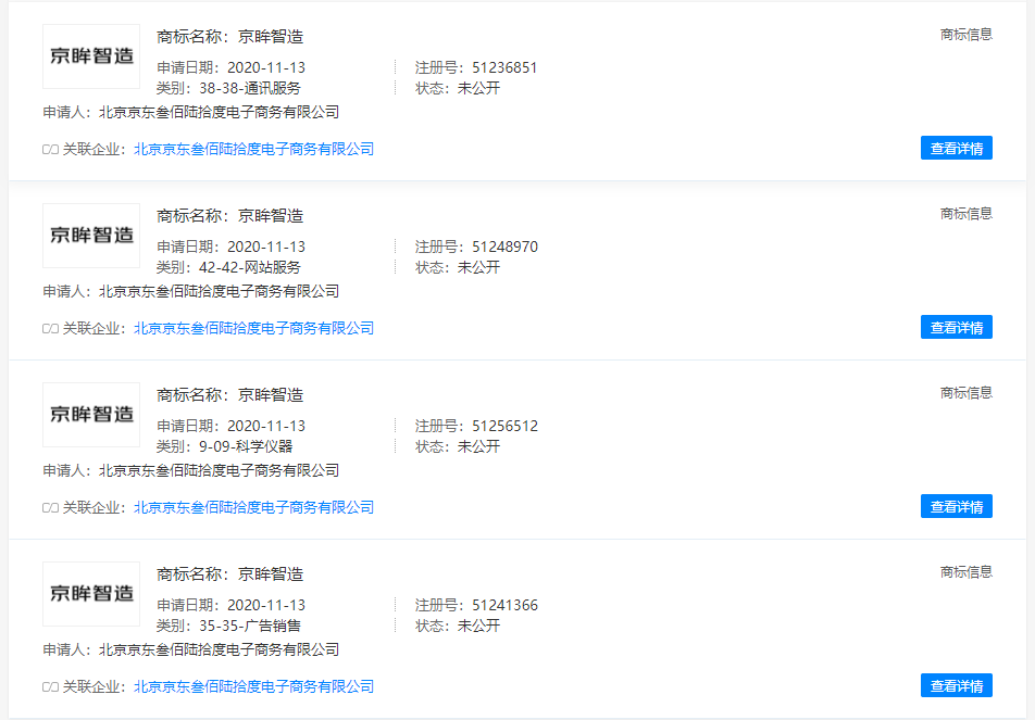 近日,北京京東叁佰陸拾度電子商務(wù)有限公司新增多條名稱(chēng)為“京眸智造”的商標(biāo)信息,申請(qǐng)日期在2020年11月,涉及國(guó)際分類(lèi)包括通訊服務(wù)、科學(xué)儀器、廣告銷(xiāo)售、網(wǎng)站服務(wù)等,商標(biāo)狀態(tài)均為商標(biāo)申請(qǐng)中。北京京東叁佰陸拾度電子商務(wù)有限公司成立于2007年4月,注冊(cè)資本為9.2億人民幣,法定代表人為劉強(qiáng)東。