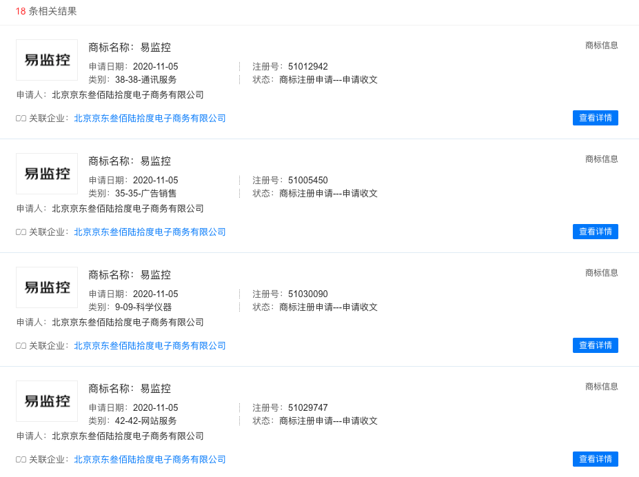 近日,北京京東叁佰陸拾度電子商務(wù)有限公司新增多條“易監(jiān)控”商標(biāo)信息。該商標(biāo)申請日期為2020月11月5日,涉及的國際分類包含通訊服務(wù)、廣告銷售、科學(xué)儀器等。目前商標(biāo)狀態(tài)為“等待實(shí)質(zhì)審查”。