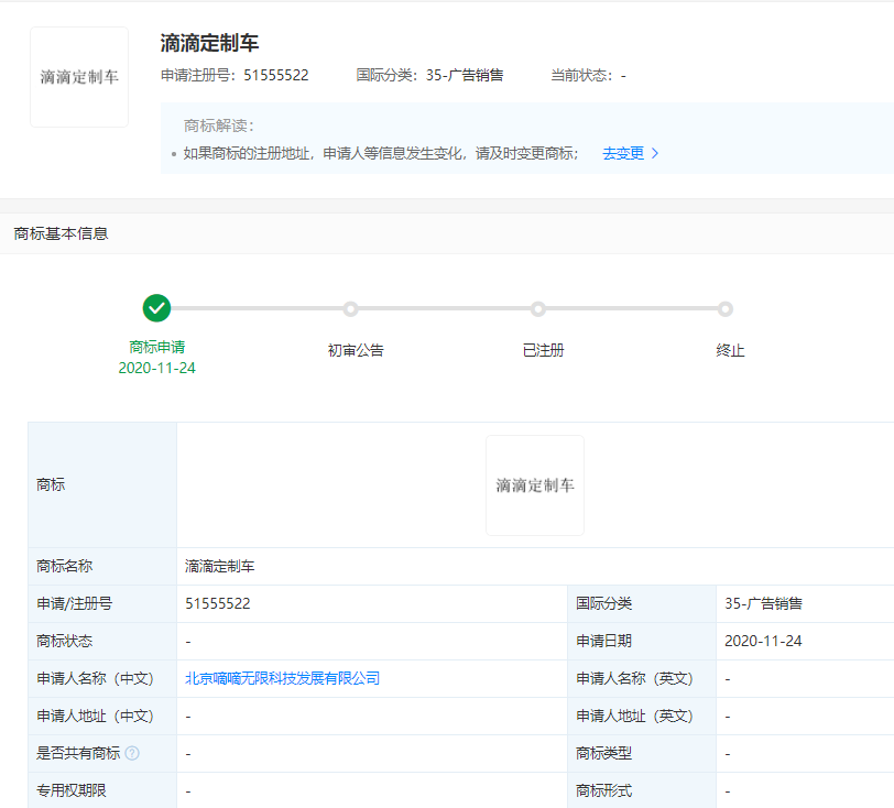 滴滴關(guān)聯(lián)公司申請“滴滴定制車”商標(biāo)