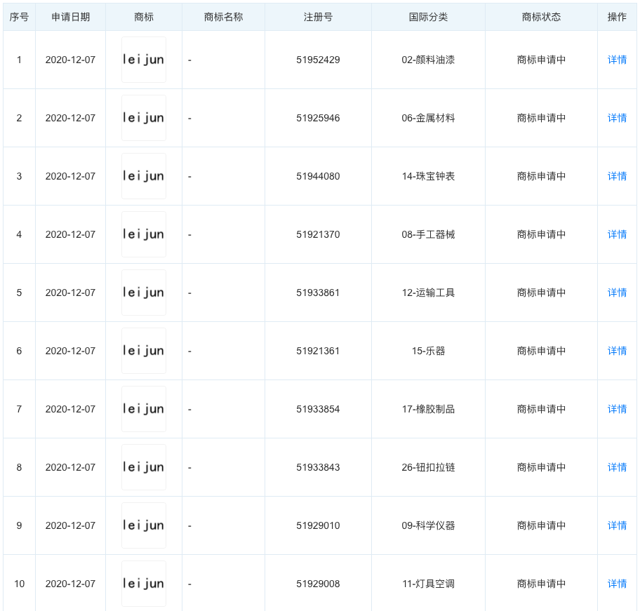 近日,小米科技有限責任公司新增多條“l(fā)ei jun”商標信息,涉及國際分類包含金屬材料、運輸工具、樂器、珠寶鐘表等。申請日期為2020年12月7日。目前商標狀態(tài)為“商標申請中”