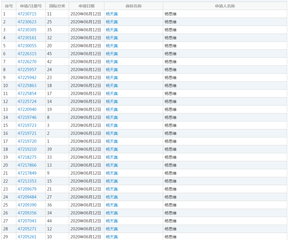 楊思維已申請“楊天真”商標,申請日期為2020年6月,涉及類別包含餐飲住宿、皮革皮具、化學原料、機械設備等。公開資料顯示,楊天真真名楊思維,為壹心娛樂創(chuàng)始合伙人,楊天真商標已被申請全類別保護。