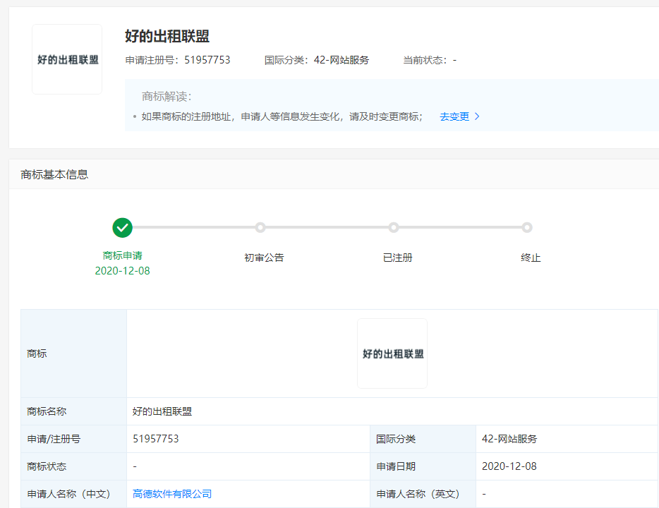 高德關(guān)聯(lián)公司申請“好的出租聯(lián)盟”商標(biāo)